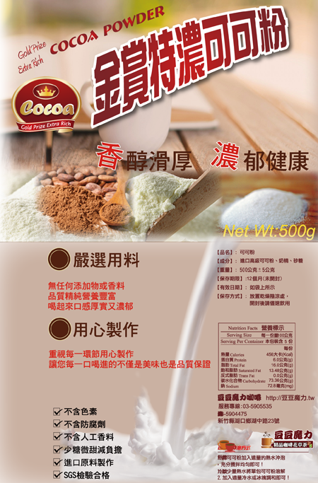 ◆ 豆豆魔力咖啡的可可粉採用進口特級中脂高純度可可粉為主要原料,輔以部份奶精粉調整口感(純可可粉太苦),除糖之外沒有再加其它任何添加物或香料,品質精純營養豐富,喝起來十分厚實濃郁,在冷冷的天氣裡來上一杯感覺份外溫暖。