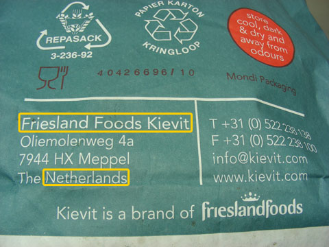 這是背面的照片,黃色框標示出來的是Friesland Foods Kievit 以及Netherlands的字樣: