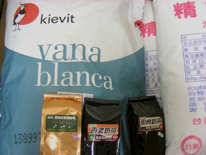 這是工廠裡的荷蘭奇異鳥奶精粉,右邊可以看到台糖的糖。特別放了幾包我們生產的產品用以證明這照片